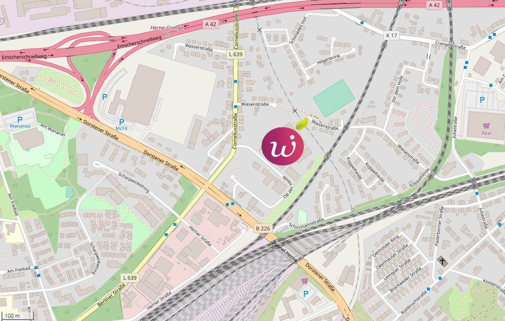 Sehr verkehrsgünstige Anbindung an die A 42, Ausfahrt Herne Crange, ca. zwei Autominuten entfernt.